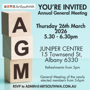 The ArtSouthWA 2026 AGM will be held 5.30 pm Thursday 26th March 2026 at the Juniper Community Centre 15 Townsend St Lockyer 6330. Refreshements available from 5pm