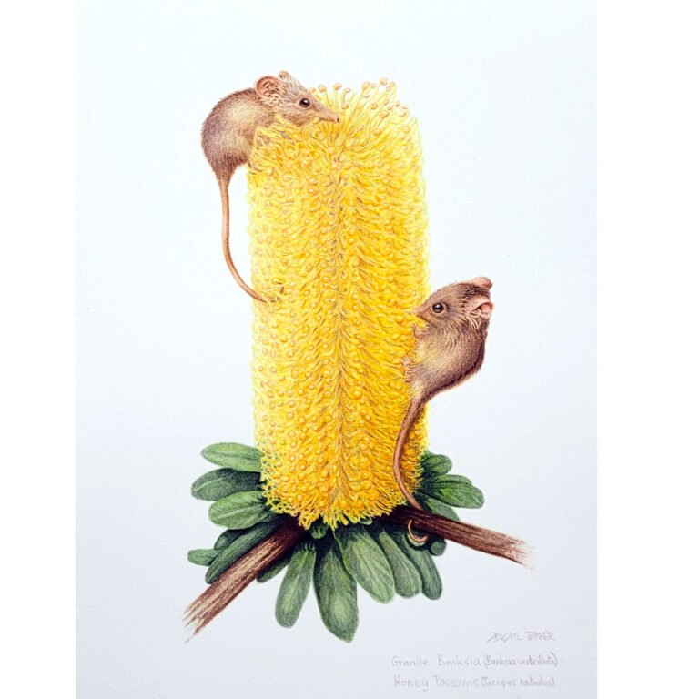 Abigail’s artwork focuses on the inhabitants and habitat around Albany W.A,, exploring environmental issues. She is deeply concerned with highlighting the plight of our increasingly rare and endangered flora and fauna.